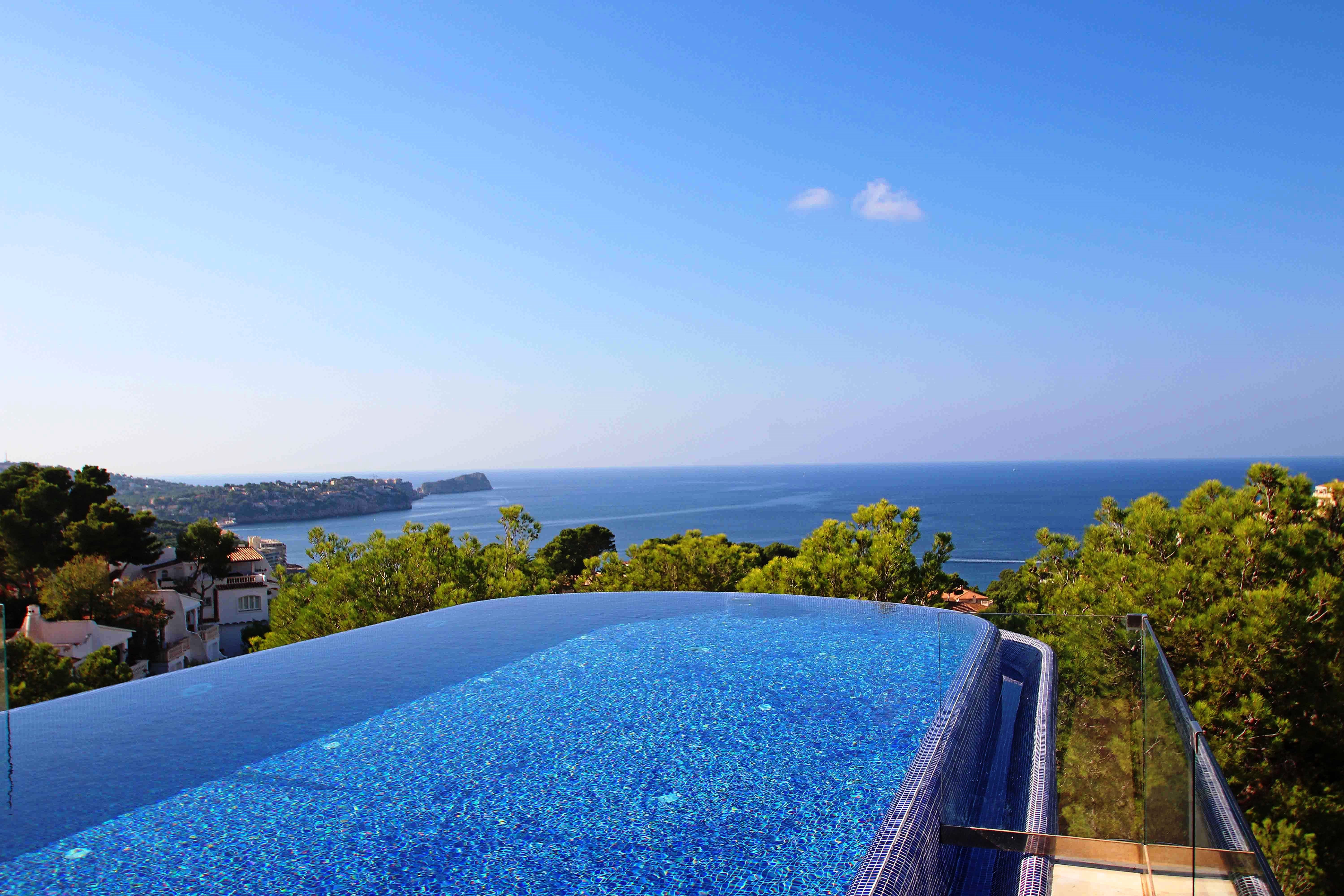 This unique villa with amazing sea views is situated in a dreamlike location on a top of the hill in Costa de la Calma in Mallorcas Southwest. This top-end luxury property has been built in 2008 on a ground of 3.183 m2 with a living area of 482 m2 distributed on two levels. There are spacious living room, a separate dining area, a fully equipped high quality Siematic kitchen with adjacent utility room, a guest toilet and a bedroom with bathroom en suite, all with an access to a stunning terrace with infinity pool, BBQ area and breathtaking views towards the open sea on the upper level. In the lower living area you find three enormous bedroom suites, two of them with access to a second pool area. Ample covered and open terraces and a spacious garage complete the offer of this exclusive villa in Costa de la Calma. Additional Features: Fully equipped luxury Siematic kitchen, utility room, guest toilet, dressing areas, BBQ, outdoor shower, 2 x swimming pool (salt water), garage, under floor heating, air conditioning hot/cold, double glazed windows, high quality fittings & furniture, jacuzzi